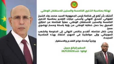 أتشرّف بأن أرفع إلى فخامة رئيس الجمهورية السيد محمد ولد الشيخ الغزواني أصدق التهاني وأسمى عبارات التقدير بمناسبة الذكرى الخامسة…