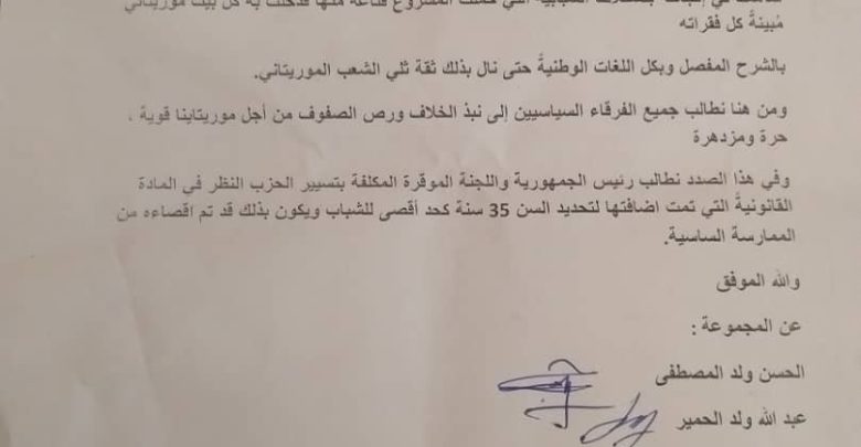 كما طالبوا رئيس الجمهورية وقيادة الحزب الحزب والمتثلة في لجنة تسيير الحزب بإعاده النظر إلى المادة التي بموجبها يتم تحديد سن الشباب ب 35 معتبرين تلك المادة قيست على مقاسهم من أجل استهدافهم واقصاءهم من المشهد السياسي بفعل أيادي كانت تلعب على ذلك