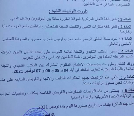 وأكد التعميم أن هذه الترتيبات تلغي جميع مذكرات التكليف والإنابة والتفويض السابقة عليها لحين صدور ترتيبات جديدة، مشيرا إلى أنه تستثنى منها المذكرات والتفويض الخاصة بمكاتب وتمثيليات الحزب في الولايات المتحدة الأمريكية وفرنسا وإسبانيا.