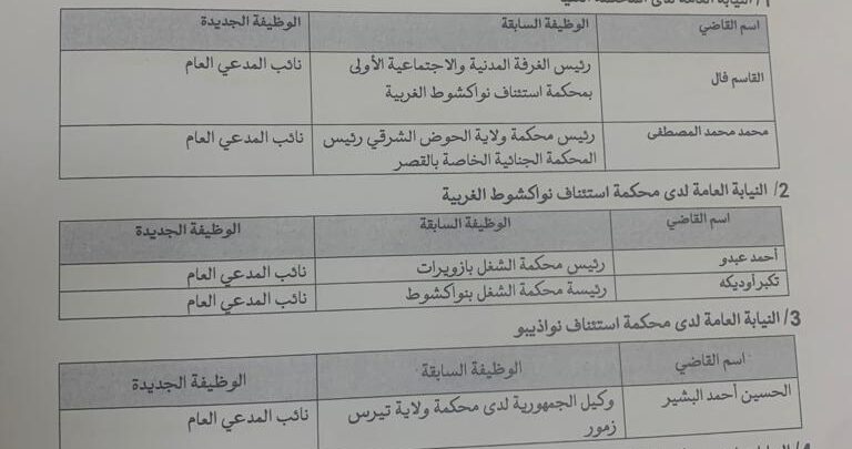 أجرى المجلس الأعلى للقضاء في دورته العادية اليوم والتي ترأسها الرئيس محمد ولد الغزواني تغييرات واسعة في صفوف القضاة.