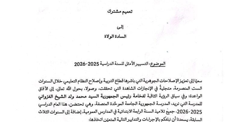 وطالب التعميم بالقيام بحملات توعية وتحسيس بالتعاون مع رابطات أولياء التلاميذ، ضمانا للبدء الفعلي للدروس يوم الافتتاح 06 أكتوبر 2025.